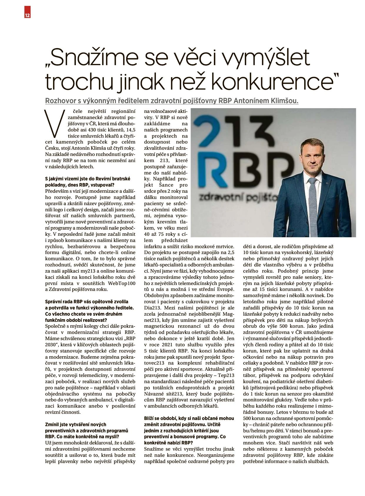 Už jsem mnohokrát deklaroval, že s dalšími zdravotními pojišťovnami nechceme soutěžit a usilovat o to, která bude mít lepší plavenky nebo největší příspěvky na volnočasové aktivity. V RBP si nově zakládáme na našich programech a projektech na dostupnost nebo zkvalitňování zdravotní péče s přívlastkem 213, které postupně zařazujeme do naší nabídky. Například projekt Šance pro srdce přes 2 roky na dálku monitoroval pacienty se srdečně-cévními obtížemi, zejména vysokým krevním tlakem ve věku mezi 40 - 75 roky s cílem předcházet infarktu a snížit riziko mozkové mrtvice. Do projektu se postupně zapojilo na 2,5 tisíce našich pojištěnců a několik desítek lékařů-specialistů a odborných ambulancí. Nyní jsme ve fázi, kdy vyhodnocujeme a zpracováváme výsledky tohoto jednoho z největších telemedicínských projektů u nás a možná i ve střední Evropě. Obdobným způsobem začínáme monitorovat i pacienty s cukrovkou v projektu Dia213.  Mezi našimi pojištěnci je ale zcela jednoznačně nejoblíbenější Magnet213, kdy jim umíme zajistit vyšetření magnetickou rezonancí už do dvou týdnů od požadavku ošetřujícího lékaře nebo dokonce v ještě kratší době. Jen v roce 2021 tuto službu využilo přes 5 tisíc klientů RBP. Na konci loňského roku jsme pak spustili nový projekt  Sportovec213 na komplexní rehabilitační péči pro aktivní sportovce. Aktuálně připravujeme i další dva projekty - Tep213 na standardizaci následné péče pacientů po totálních endoprotézách a projekt Návazné sítě213, který bude pojištěncům RBP zajišťovat navazující vyšetření v ambulancích odborných lékařů.
