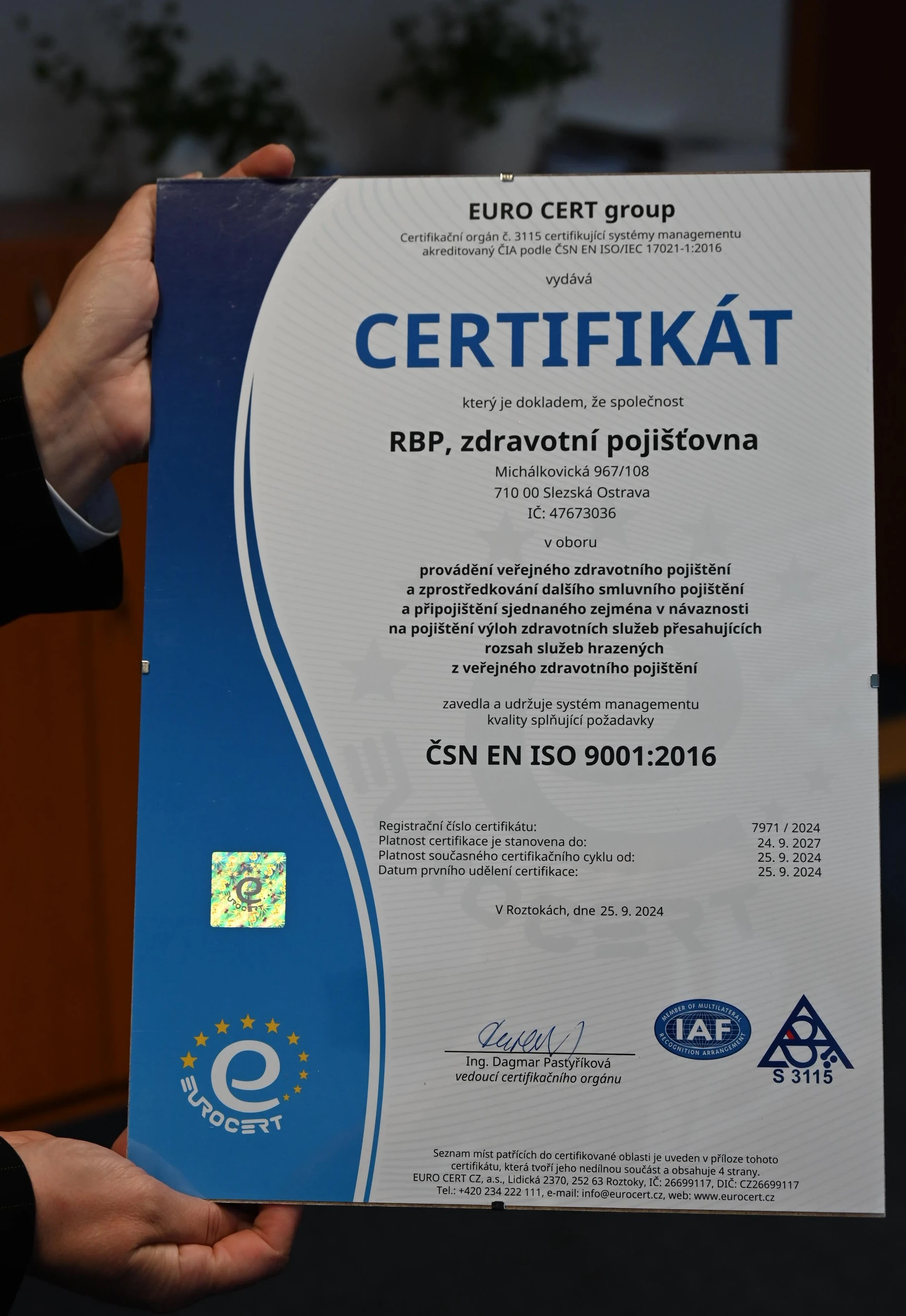 Zdravotní pojišťovna RBP 2. října 2024 získala od společnosti EURO CERT group certifikát ISO 9001 v oboru veřejného zdravotního pojištění a zpracování dalšího smluvního pojištění. Systém řízení kvality je aktuálně nejvyhledávanější normou pro řízení jakosti na světě s více než milionem certifikovaných organizací ve 180 zemích po celém světě. RBP ho chce konkrétně využít ke garanci trvalé kvality služeb poskytovaných pojištěncům této pojišťovny.
